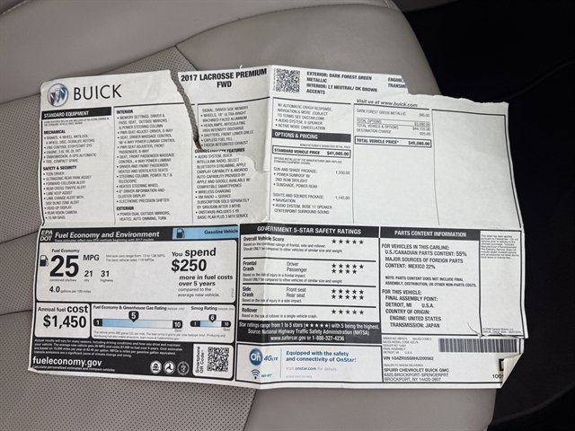 One Owner ---- 2017 Buick LaCrosse Premium – Luxurious Comfort, Cutting-Edge Technology, and Outstanding Efficiency Elevate your driving experience with this 2017 Buick LaCrosse Premium. Powered by a refined 3.6L V6 engine paired with an 8-speed automatic transmission, this sedan delivers impressive performance and an outstanding 31 MPG highway—perfect for luxury cruising and daily commuting alike. Inside, enjoy a sophisticated leather interior with heated, cooled, and massaging front seats, along with dual-zone automatic climate control that ensures comfort for all passengers. The 8.0" touchscreen features navigation, Apple CarPlay, and Android Auto, seamlessly connecting you to your favorite apps and destinations. The 8.0" gauge cluster screen and Heads-Up Display keep vital information front and center, while the premium Bose Center Point Sound System provides concert-quality audio. Enhance your safety and convenience with blind spot monitoring with rear cross traffic alert, forward collision warning with automatic emergency braking, lane keep assist, and a backup camera. The power panoramic moonroof floods the cabin with natural light, making every drive more enjoyable. With its blend of luxury, advanced safety features, and excellent fuel economy, this Buick LaCrosse Premium is designed to provide a premium driving experience every time you get behind the wheel. It also comes with a 3 month/3,000 mile warranty for peace of mind. Call or text us today to schedule your test drive! Don’t miss the opportunity to own this luxurious, feature-rich sedan—make this 2017 Buick LaCrosse Premium yours today!